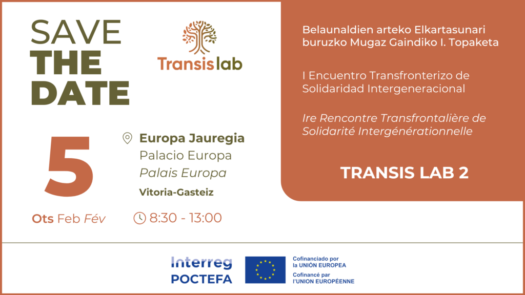 La Première Rencontre Transfrontalière sur la Solidarité Intergénérationnelle se tiendra le 5 février prochain, de 08h30 à 13h00, au Palais des Congrès Europa (Vitoria-Gasteiz). Cette rencontre marque le lancement public du projet européen TRANSIS LAB 2. Coopération transfrontalière en solidarité intergénérationnelle, une initiative qui promeut de nouvelles formes de solidarité entre les générations dans l’espace POCTEFA.